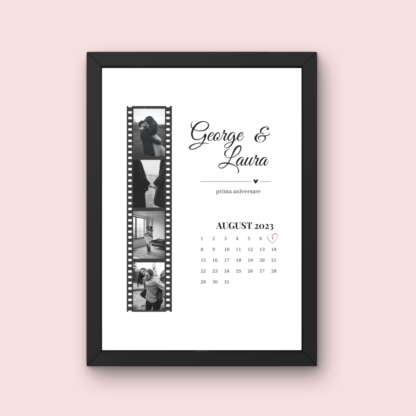 Adaugă numele voastre, luna, data și anul momentului special și 4 fotografii care spun povestea iubirii voastre.