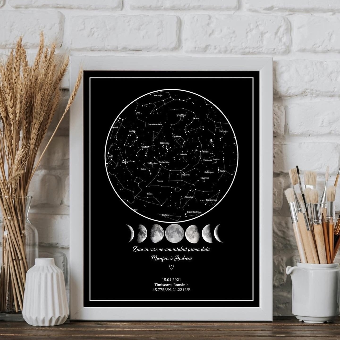 Tabloul nostru Harta Stelelor îți va arăta poziția exactă a stelelor și constelațiilor într-un moment ales de tine în funcție de dată oră și locație. Folosim Observatorul Las Cumpres pentru a îți aduce imaginea cerului 100% reală. Chiar dacă evenimentul tău a avut loc în timpul zilei și nu le vezi, stelele sunt mereu acolo strălucind la fel de puternic.